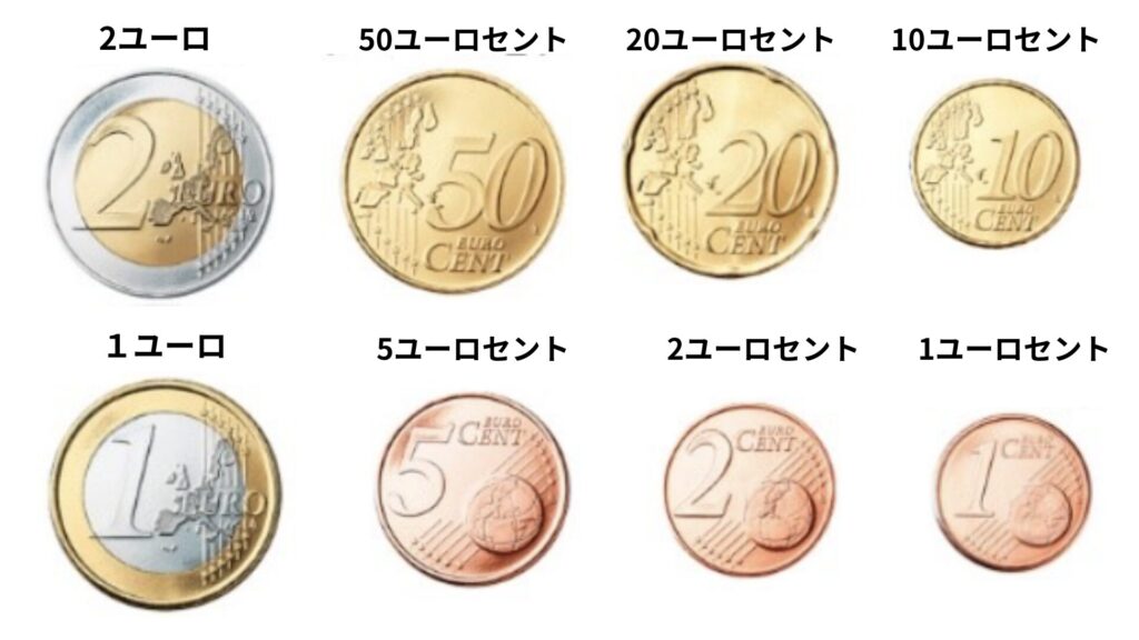 1, 2ユーロ、1, 2, 5, 10, 20, 50ユーロセント。