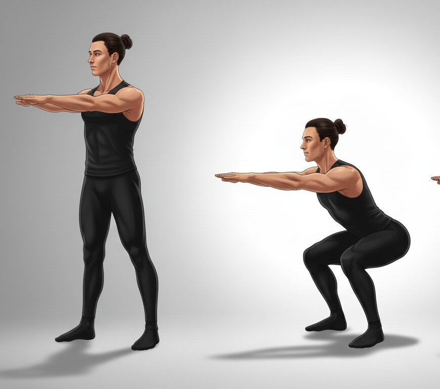 3. 太ももが床と平行になるくらいまで下げたら、ゆっくり元の位置に戻る。