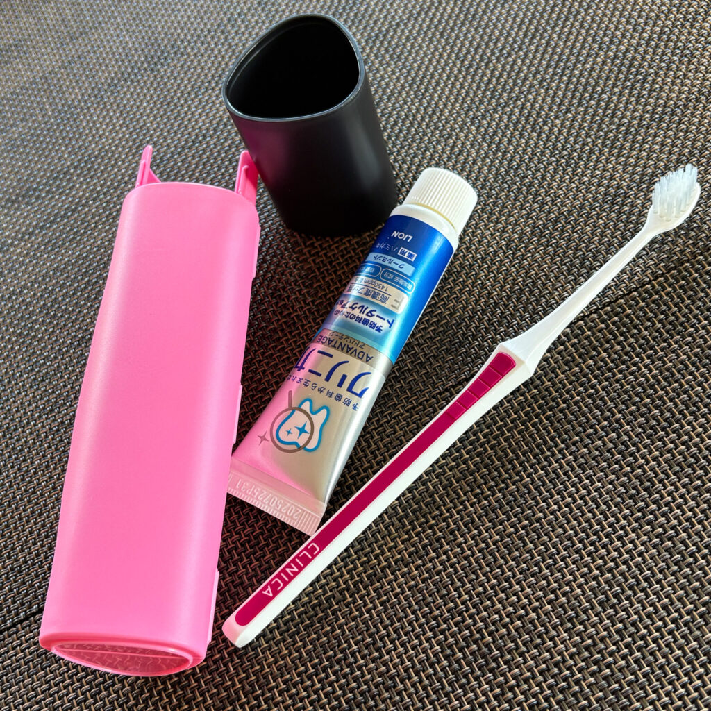 海外のホテルは歯ブラシが置かれていないのが標準。100均ならコンパクトなものが手に入ります。ケース付きなので機内への持ち込みもスマートです。こだわりのある場合はドラッグストアやスーパーで使い慣れたメーカーのトラベルセットを購入しておきましょう。