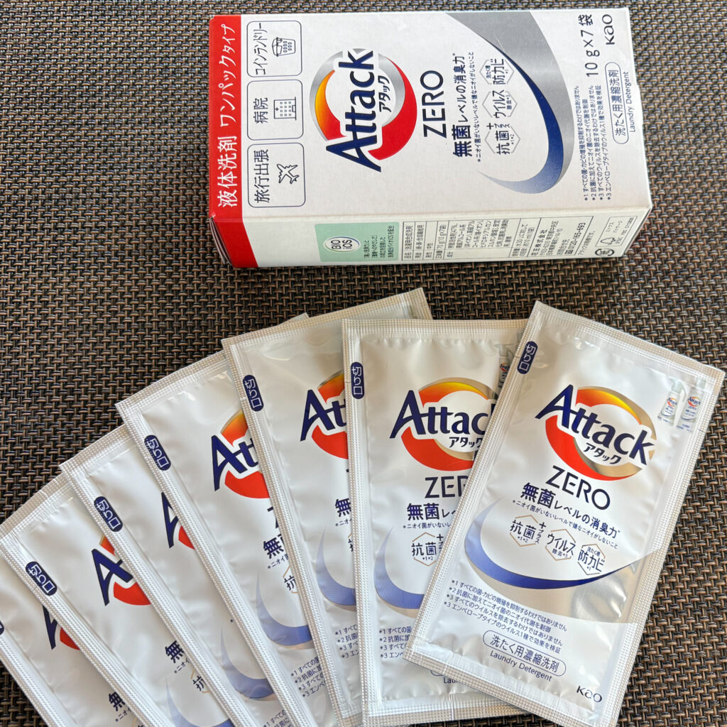 1回分ずつパックされた洗剤。下着や靴下を洗面台で手洗いするのに便利です。