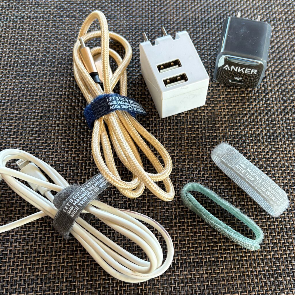 ケーブルは予備があると安心。クリップでまとめておくと、スーツケースの中で絡まりません