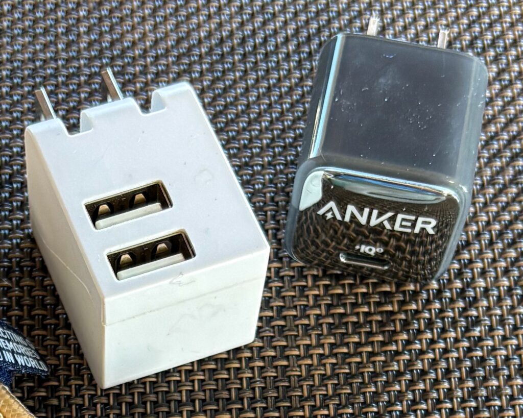 100均でも十分使えますが、2000円くらいで同時充電できるプラグが便利です。スマホ、充電器、イヤホン、PC・・・と、充電が必要なガジェットが多いですからね。最近はUSBではなくCタイプの充電コードが増えているので、ご自身が必要な差込口のタイプと数を確認してから購入しましょう。